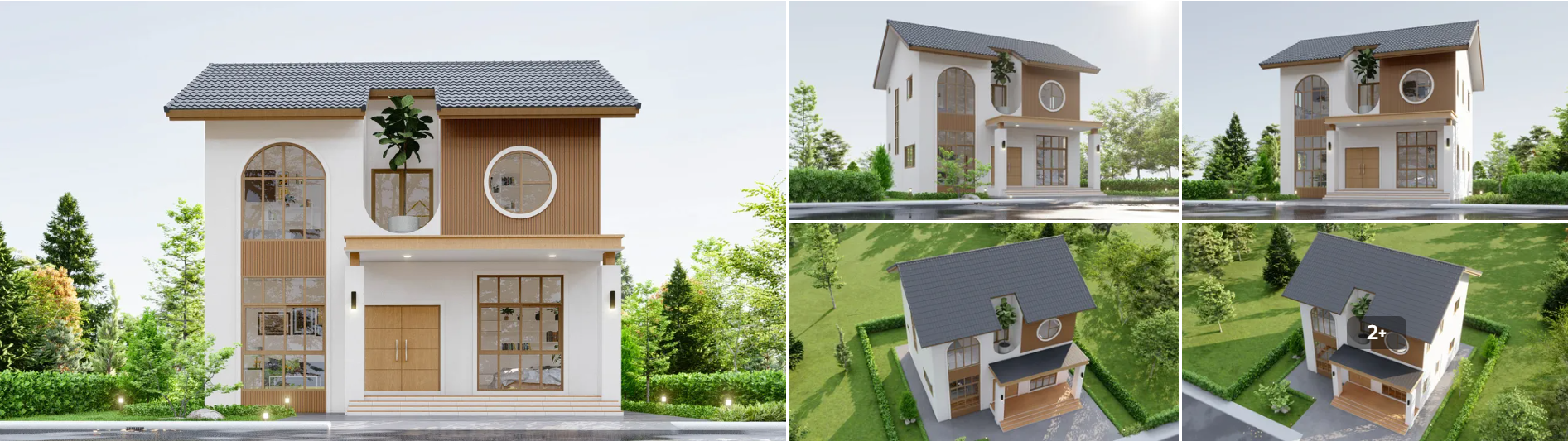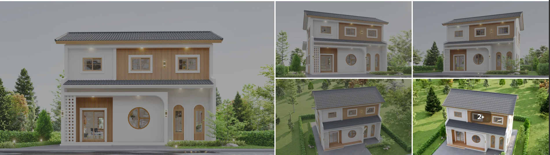บ้านเดี่ยว 2 ชั้น Modern Japanese Style ดีไซน์โดดเด่นด้วยช่องหน้าต่างทรงโค้งและวงกลมตัดกับผนังไม้ ทำให้บ้านดูอบอุ่น เรียบง่าย แต่มีเอกลักษณ์เฉพาะตัวอย่างเห็นได้ชัด