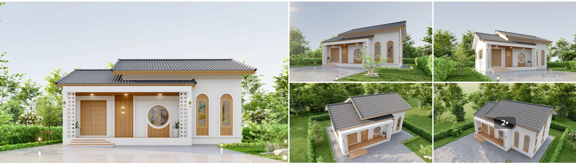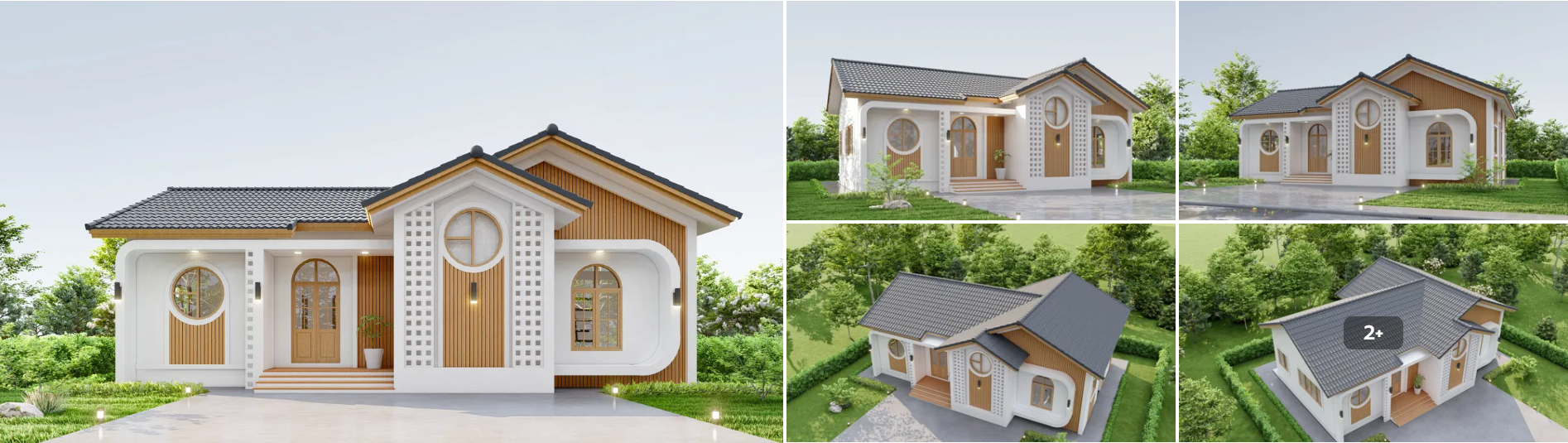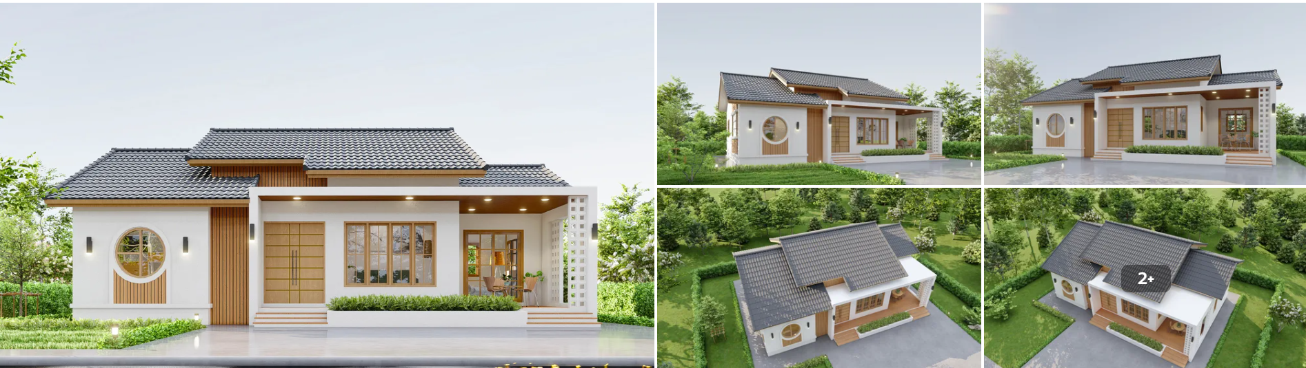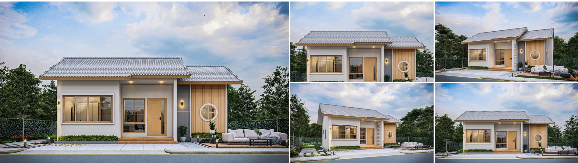 บ้านชั้นเดียวสไตล์ Minimal Muji เน้นความเรียบง่ายของโทนขาวตัดไม้ พร้อมหน้าต่างทรงกลมและเส้นสายระแนงแนวตั้ง ให้ความอบอุ่นแบบญี่ปุ่นผสมความโปร่งโล่งทันสมัย เหมาะกับครอบครัวเล็กที่รักความสงบ