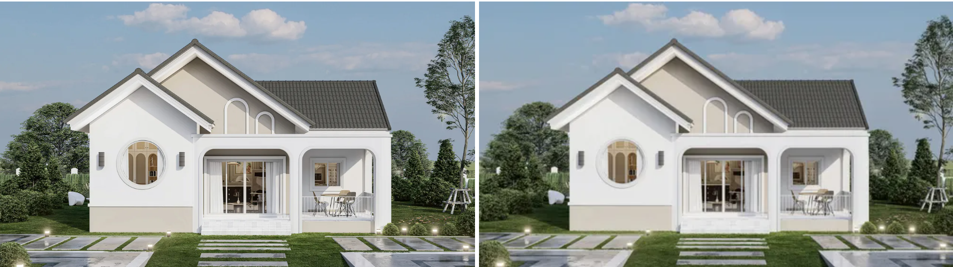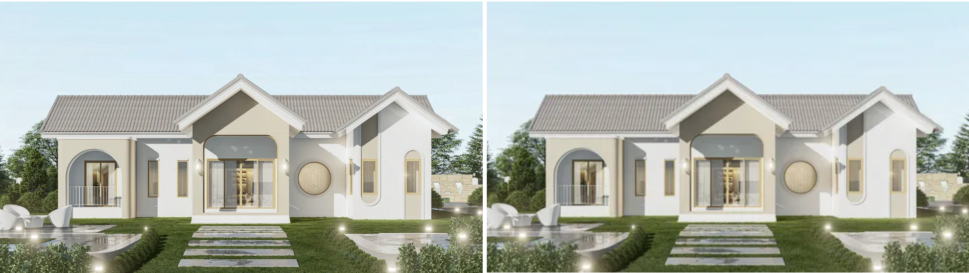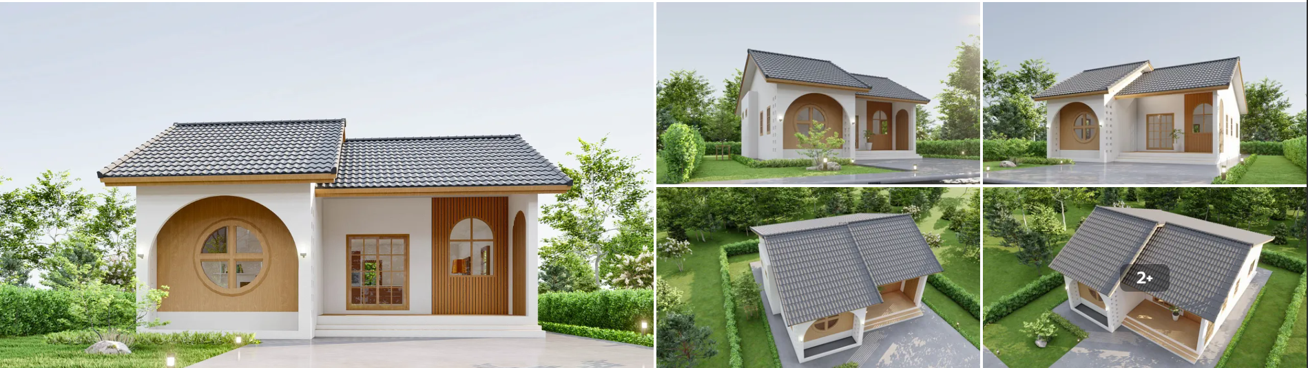 บ้านชั้นเดียวสไตล์โมเดิร์นมินิมอล โดดเด่นด้วยประตูและหน้าต่างทรงโค้งมน พร้อมผนังช่องลมตกแต่ง ทำให้ตัวบ้านดูโปร่งและน่ารักอบอุ่น