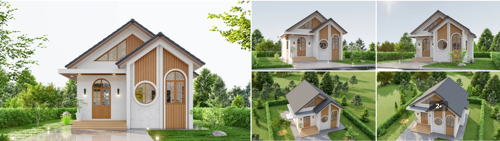 บ้านชั้นเดียวสไตล์มินิมอล-ญี่ปุ่น หลังคาจั่วเรียบคลาสสิก โดดเด่นด้วยหน้าต่างโค้งและวงกลมที่จัดวางอย่างสมดุล เสริมด้วยผนังไม้โทนอุ่นตัดกับสีขาว ทำให้บ้านดูโปร่ง อบอุ่น และมีเอกลักษณ์