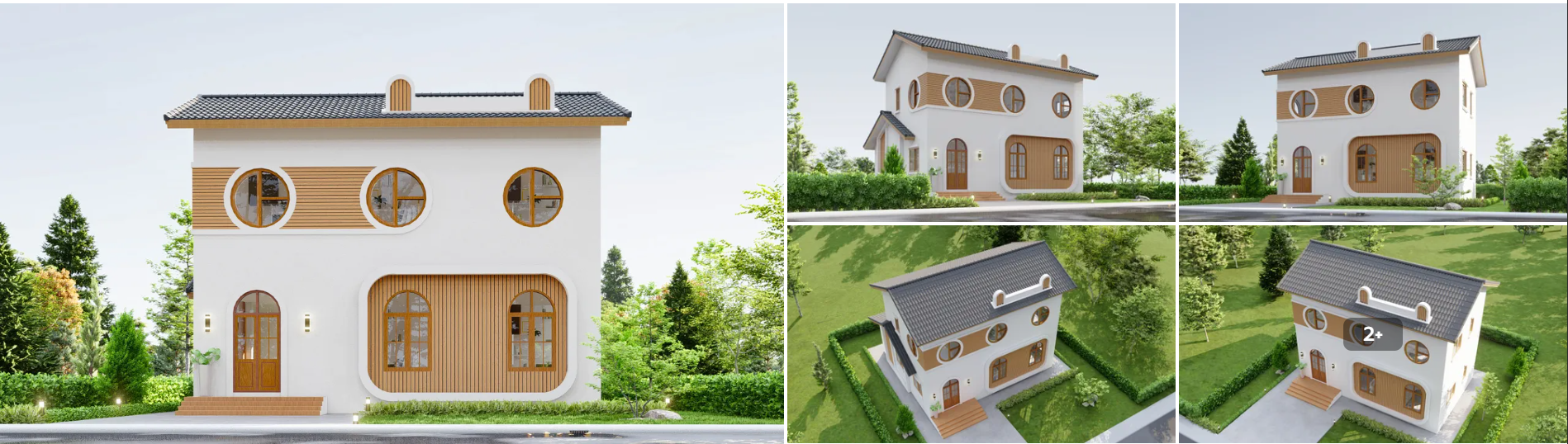 โมเดิร์นผสมกลิ่นอายมินิมอลญี่ปุ่น หลังคาเล่นระดับทำให้บ้านดูโปร่งทันสมัย มีช่องลมช่วยเพิ่มมิติและระบายอากาศได้ดี หน้าต่างทรงวงกลมที่เป็นเอกลักษณ์ สร้างคาแรกเตอร์ให้บ้านดูแตกต่างและน่าจดจำ