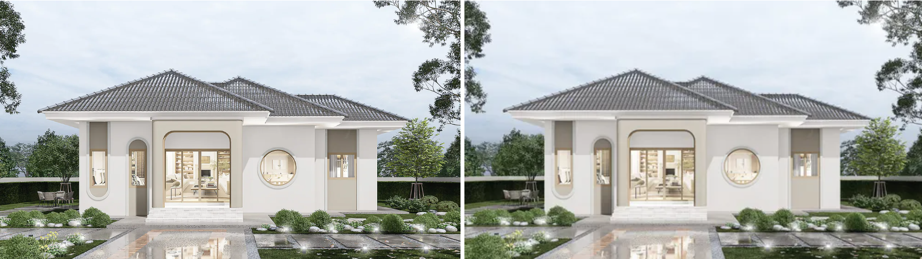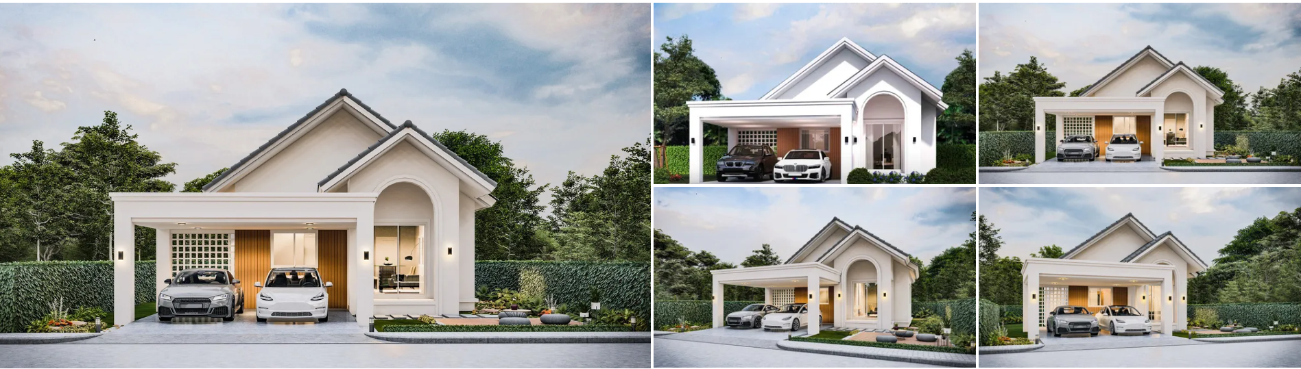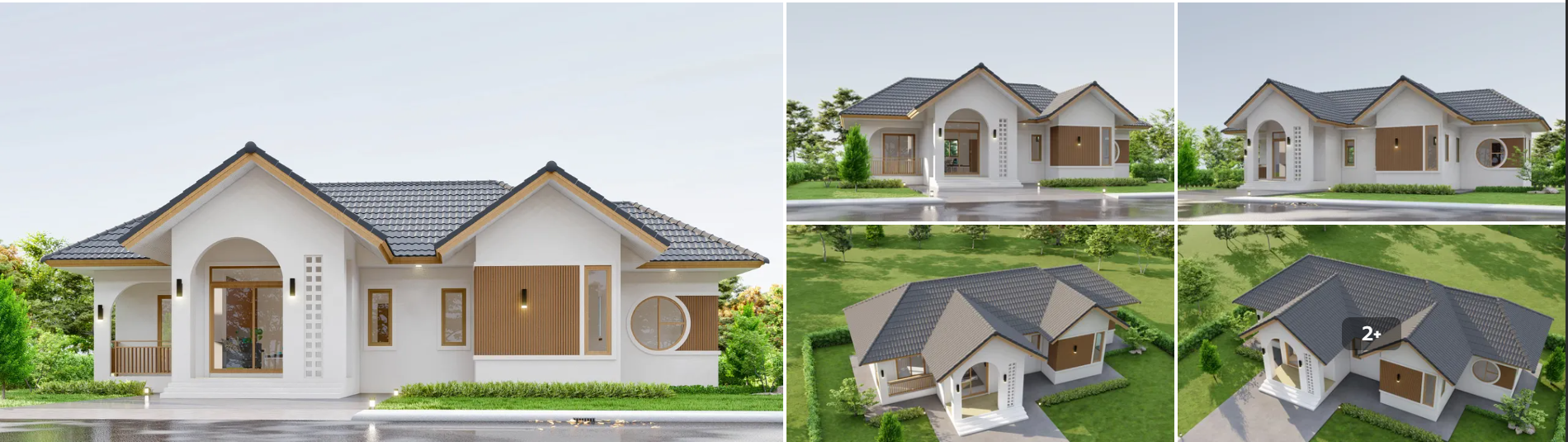 บ้านชั้นเดียวสไตล์โมเดิร์นโคโลเนียล โดดเด่นด้วยหน้าต่างทรงกลมและช่องโค้ง ที่แอบมีกิมมิกของบ้านสไตล์ญี่ปุ่นสอดแทรกลงเป็นเอกลักษณ์เฉพาะที่ช่วยให้บ้านดูอบอุ่นและหรูหราในเวลาเดียวกัน หลังคาทรงปั้นหยาเพิ่มความมั่นคง แข็งแรง และให้บรรยากาศคลาสสิก เหมาะสำหรับครอบครัวที่ต้องการบ้านหลังเดียวฟังก์ชันครบ ใช้งานสะดวก