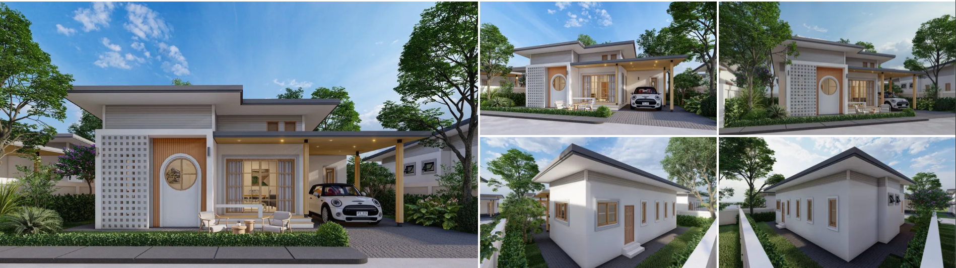 บ้านเดี่ยวชั้นเดียวสไตล์มินิมอล-คอนเทมโพรารี เน้นเส้นสายเรียบง่าย ใช้สเปซได้เต็มที่ พร้อมฟังก์ชันครบ 2 ห้องนอน 2 ห้องน้ำ และลานหน้าบ้านที่เปิดโล่ง ให้ความรู้สึกโปร่งและผ่อนคลาย