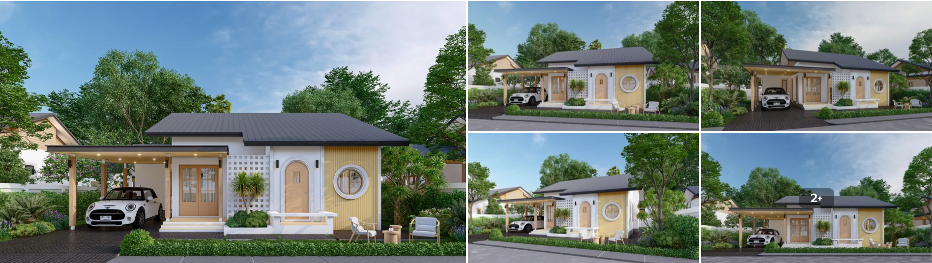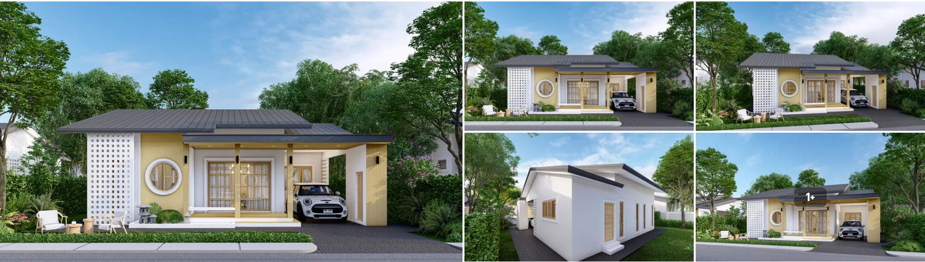 บ้านเดี่ยวชั้นเดียวทรงโมเดิร์นมินิมอล ออกแบบเรียบง่ายแต่ลงตัว โดดเด่นด้วยผนังสีเหลืองพาสเทลตัดขาว เพิ่มลูกเล่นด้วยหน้าต่างวงกลม และมีระเบียงหน้าบ้านสำหรับพักผ่อน ครบฟังก์ชัน 3 ห้องนอน เหมาะสำหรับครอบครัวที่ต้องการความอบอุ่นและเป็นส่วนตัวในขนาดที่พอเหมาะ