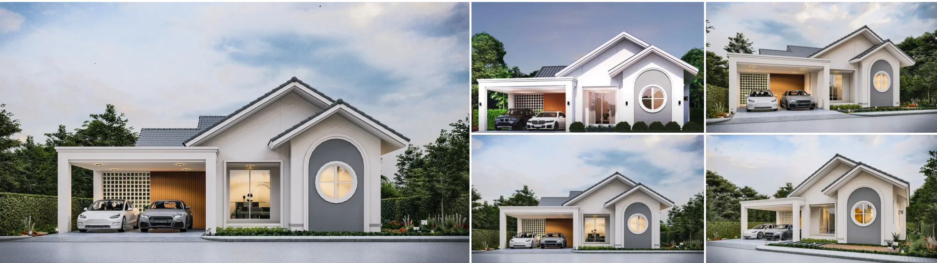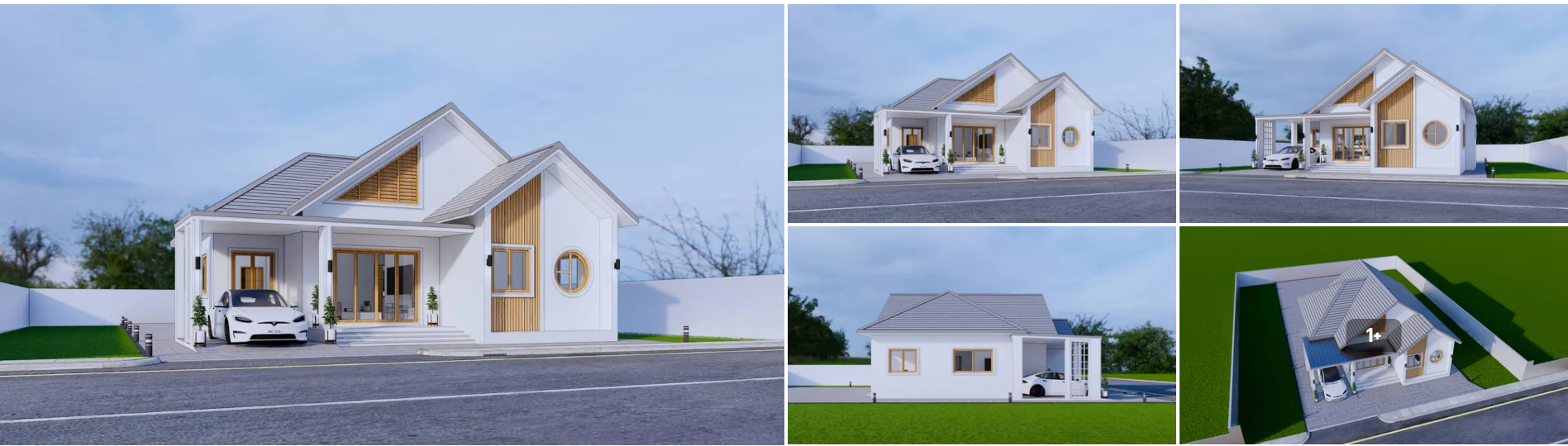 บ้านชั้นเดียวสไตล์โมเดิร์น-มินิมอล ใช้โทนสีขาวผสมไม้ ทำให้บ้านดูอบอุ่น เรียบง่าย และร่วมสมัย มีช่องแสงบานใหญ่และหน้าต่างวงกลมที่เป็นกิมมิกเฉพาะ เน้นความโปร่งโล่ง เหมาะกับครอบครัวขนาดกลางที่ชอบบรรยากาศโมเดิร์นอบอุ่น