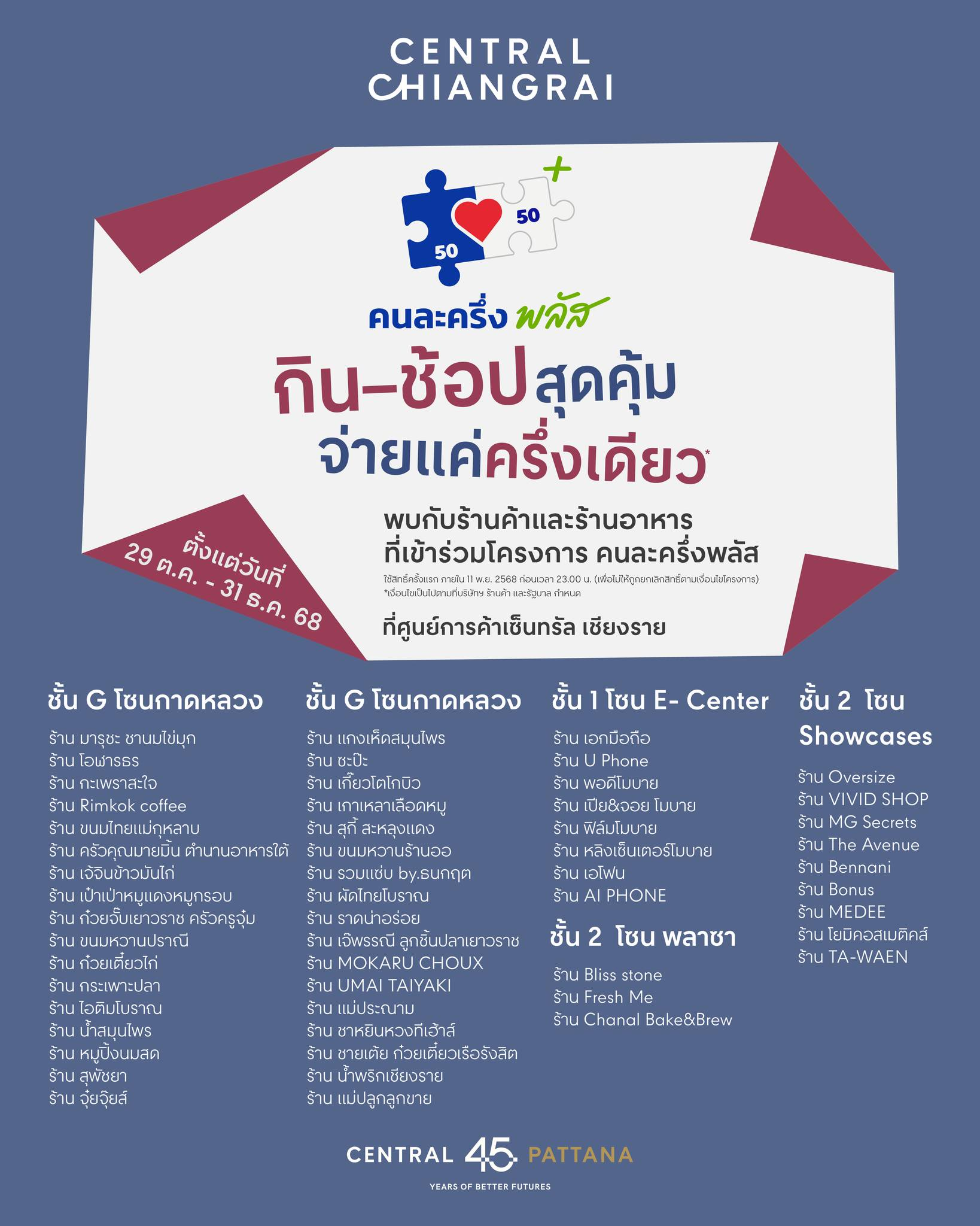 แวะเซนทรัล เชียงราย แล้วอยากใช้สิทธิคนละครึ่ง เลือกได้ตามลิสต์นี้เลย อ้างอิงจากประกาศของศูนย์การค้า ช่วงจัดกิจกรรมตั้งแต่วันที่ 29 ตุลาคม ถึง 31 ธันวาคม ปี 68 พร้อมเงื่อนไขการใช้สิทธิครั้งแรกภายใน 11 พฤศจิกายน ปี 68 ทั้งหมดเป็นไปตามเงื่อนไขของบริษัท ร้านค้า และภาครัฐ