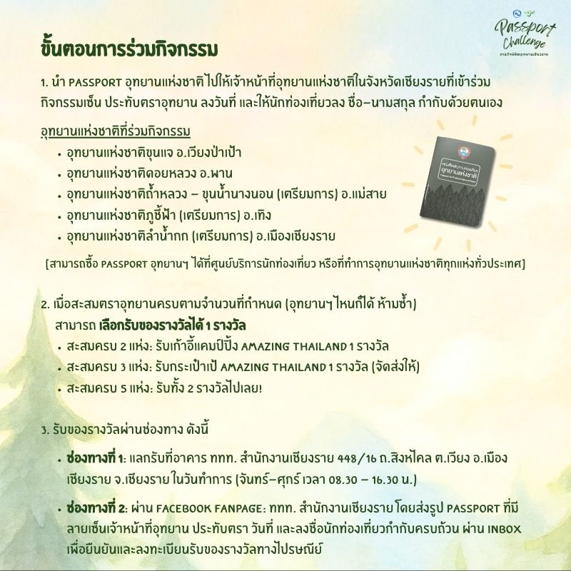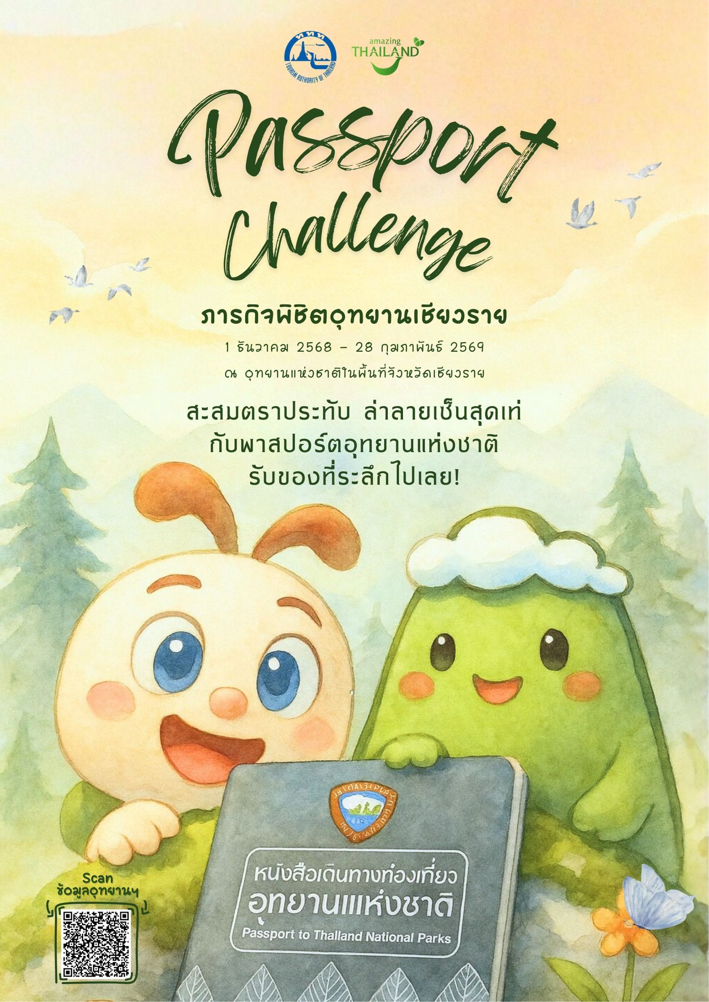 การออกเดินทางไปสูดอากาศดี ๆ ที่เชียงรายมักทำให้หลายคนรู้สึกเหมือนได้ Recharge ตัวเองแบบไม่ต้องพยายามอะไรเลย และในช่วงวันที่ 1 ธันวาคม 2568 ถึง 28 กุมภาพันธ์ 2569 ก็มีอีกหนึ่งกิจกรรมสนุก ๆ ให้สายธรรมชาติได้ลุกขึ้นมาท่องอุทยานด้วยกัน นั่นคือกิจกรรม Passport Challenge ที่ให้คุณพกสมุด Passport อุทยานแห่งชาติไปสะสมตราประทับจากอุทยานต่าง ๆ ในจังหวัดเชียงราย สะสมครบก็รับของพรีเมียมจาก ททท. ได้เลย