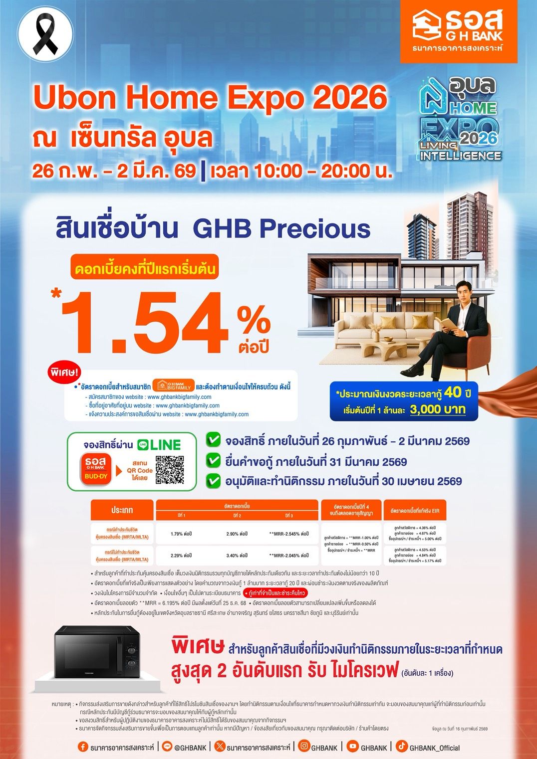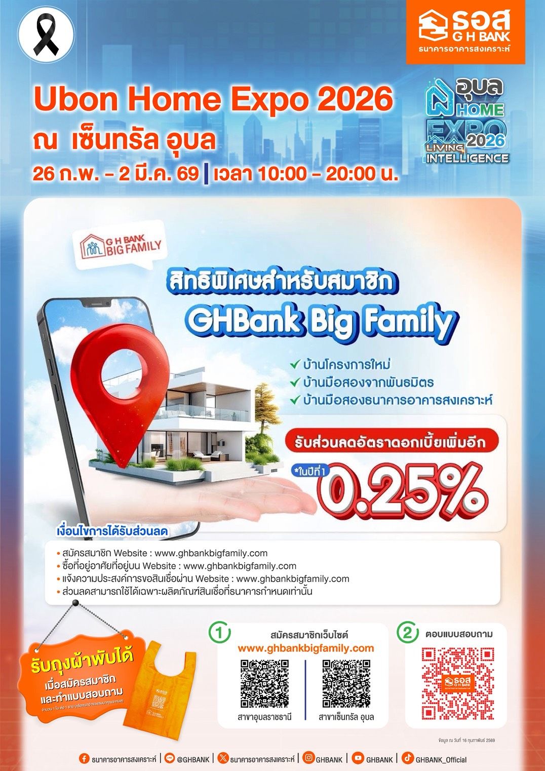 เพื่อนๆอุบลเตรียมตัวให้พร้อม มหกรรมที่อยู่อาศัยที่ยิ่งใหญ่ที่สุดแห่งปี Ubon Home Expo 2026 กำลังจะกลับมาจัดขึ้น ณ เซ็นทรัล อุบล อีกครั้ง ปีนี้ ธนาคารอาคารสงเคราะห์ (ธอส.) จัดเต็มด้วยสินเชื่อบ้านอัตราดอกเบี้ยพิเศษ ไฮไลต์สำคัญคือการมอบ ส่วนลดดอกเบี้ยเพิ่มอีก 0.25% ทำให้อัตราดอกเบี้ยปีแรกเหลือเพียง 1.54% ต่อปี เท่านั้น สิทธิ์นี้มีจำนวนจำกัด ใครอยากได้ต้องลงทะเบียนจองไว้สิทธ์ไว้ก่อนเลยที่ ลงทะเบียนจองดอกเบี้ยพิเศษในงาน Ubon Home Expo 2026