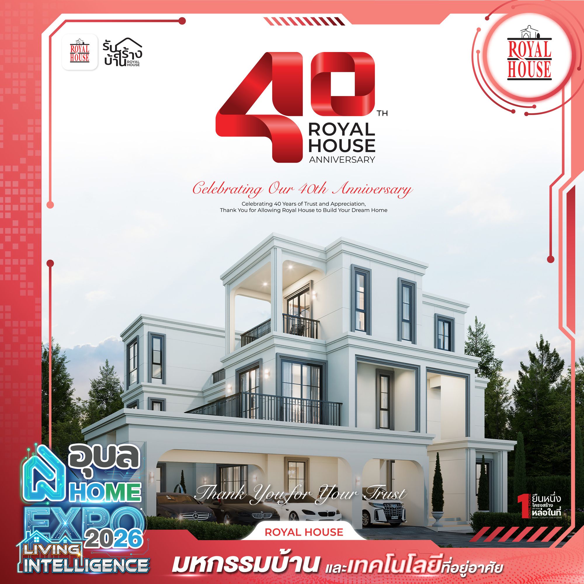 Royal House แบรนด์รับสร้างบ้านมาตรฐานระดับประเทศที่นำแบบบ้านกว่า 95 ดีไซน์มาให้เลือกสรร มั่นใจได้ด้วยระบบการก่อสร้างที่เป็นมาตรฐานสากลและประสบการณ์ยาวนาน ภายใต้สโลแกนที่เน้นความเชื่อมั่นในทุกขั้นตอน